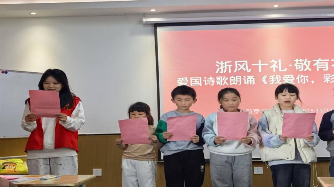 活动最后,全体小朋友与大学生志愿者齐声完整朗诵《我爱你中国》并合影留念。这场浸着“浙风有礼”与家国情怀的活动也落下帷幕。小朋友们或许还不能完全读懂诗句里的深沉,但眼底的光亮、掌心的温度,早已将“热爱”二字悄悄刻进心里;而这份跨越年龄的同频朗诵,也成了彼此记忆里一段温暖的注脚。