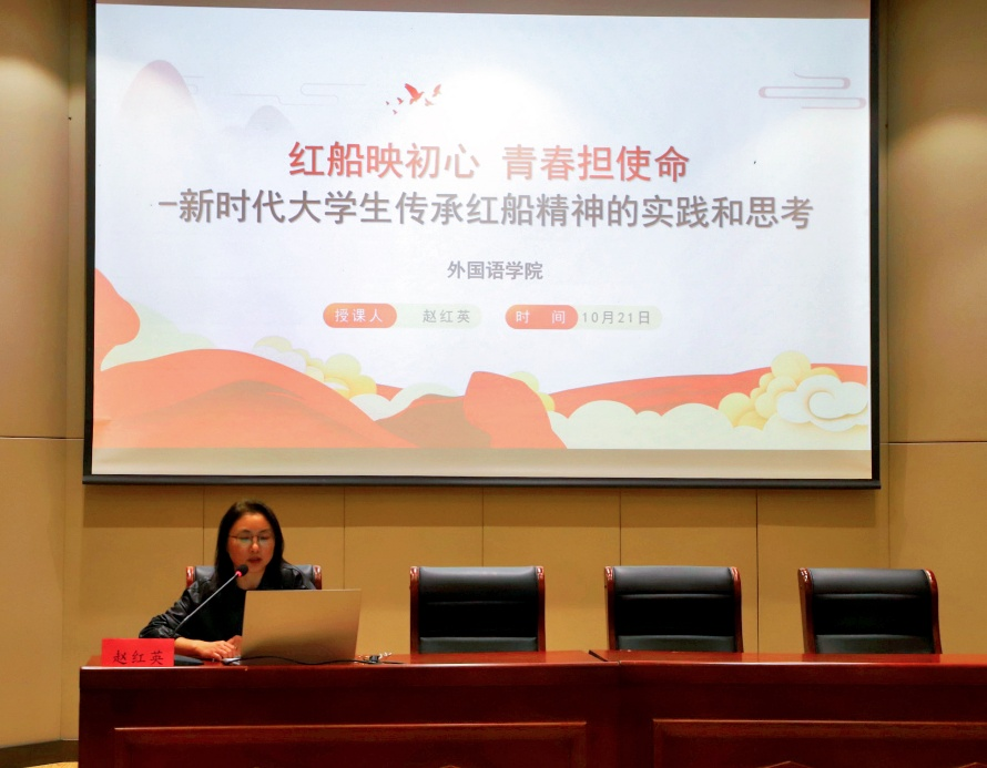 10月21日,外国语学院党总支书记赵红英于3J101讲授《红船精神》的主题党课。